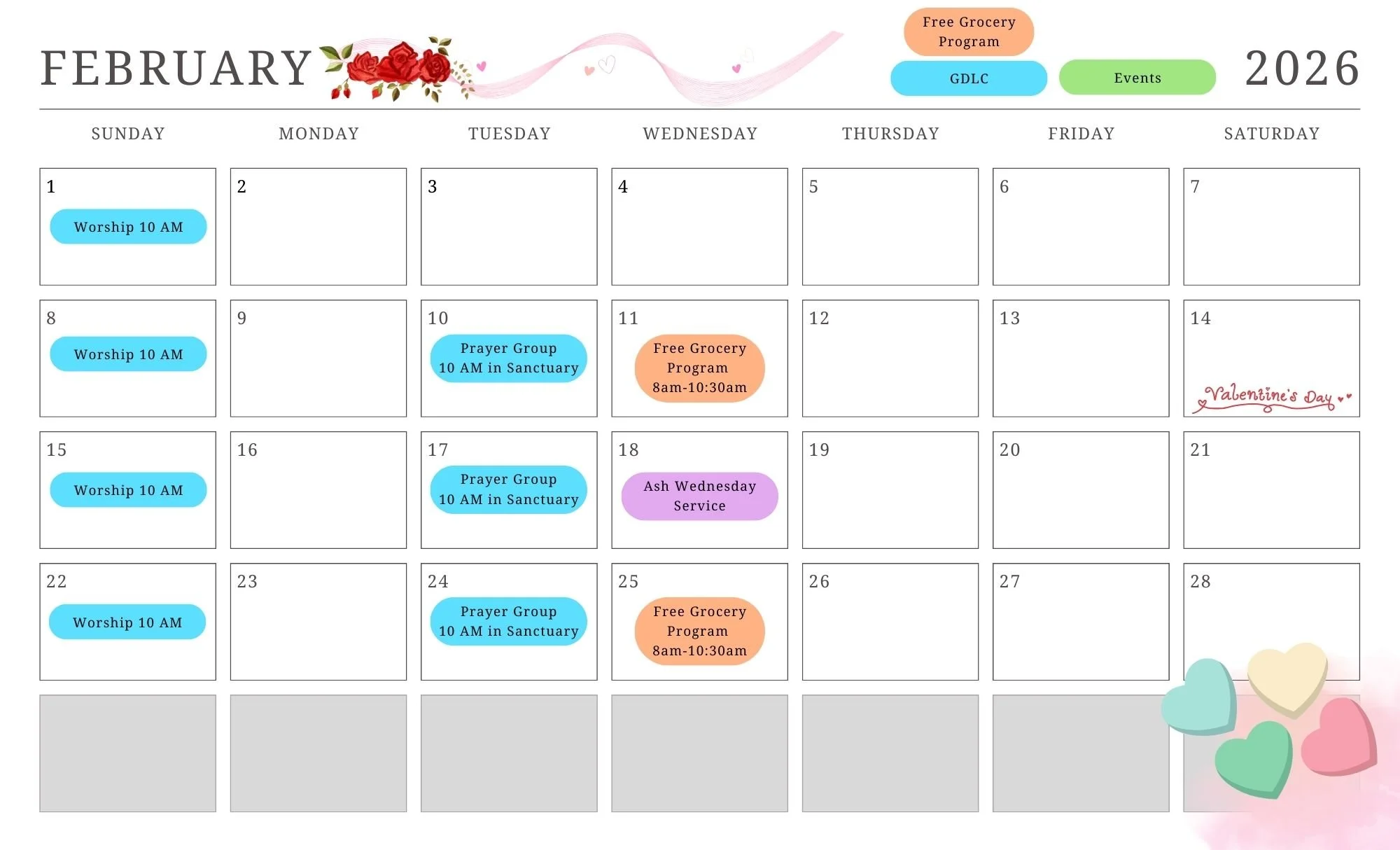 Our monthly calendar shows any special services, meetings, events, and uses of our facilities. If you have any questions about our calendar please contact our Office Administrator, Beth at office@gdlcsj.com.